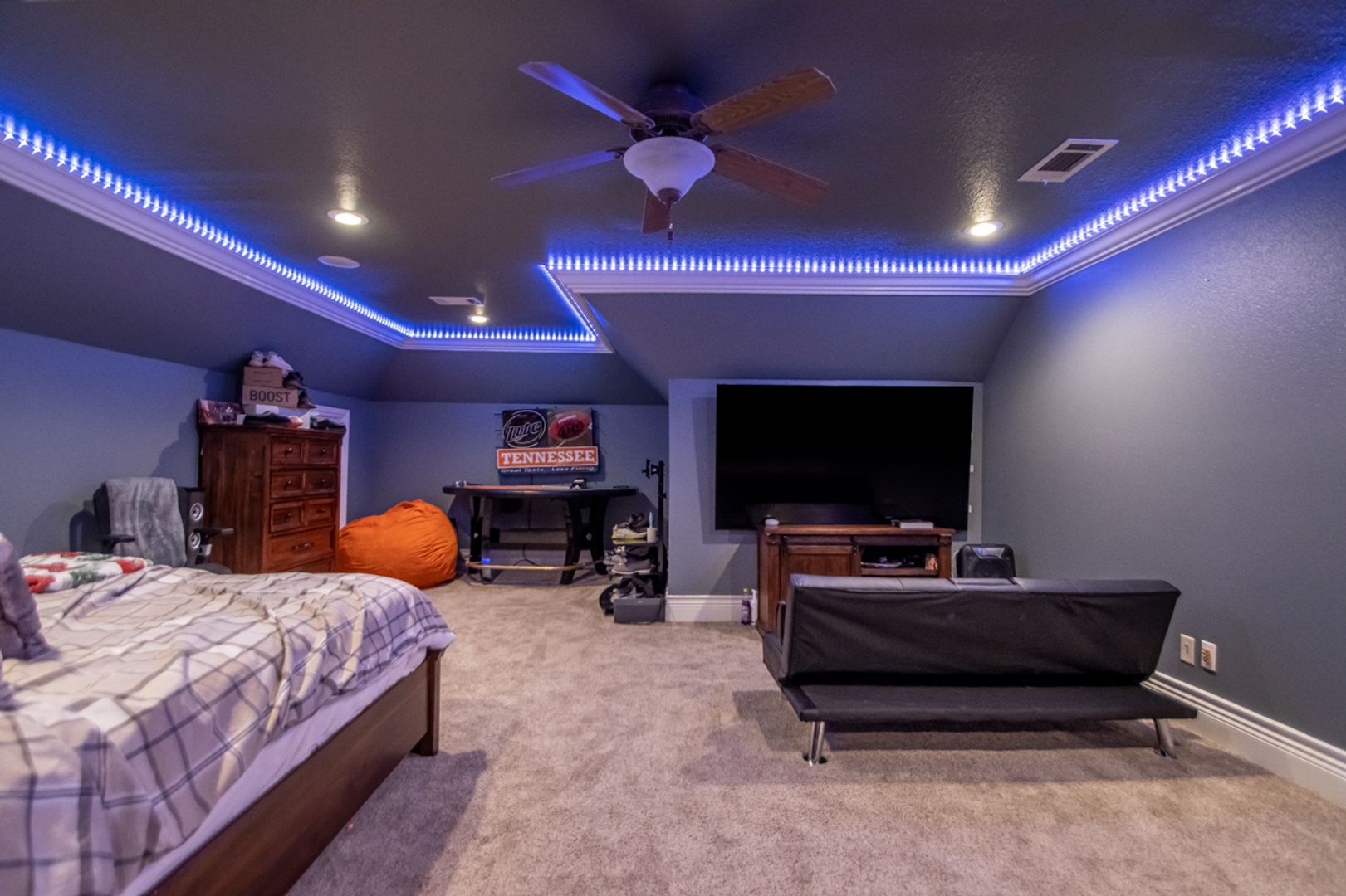 Huge upstairs game room that easily converts to a 4th bedroom, guest suite, home office, or gym