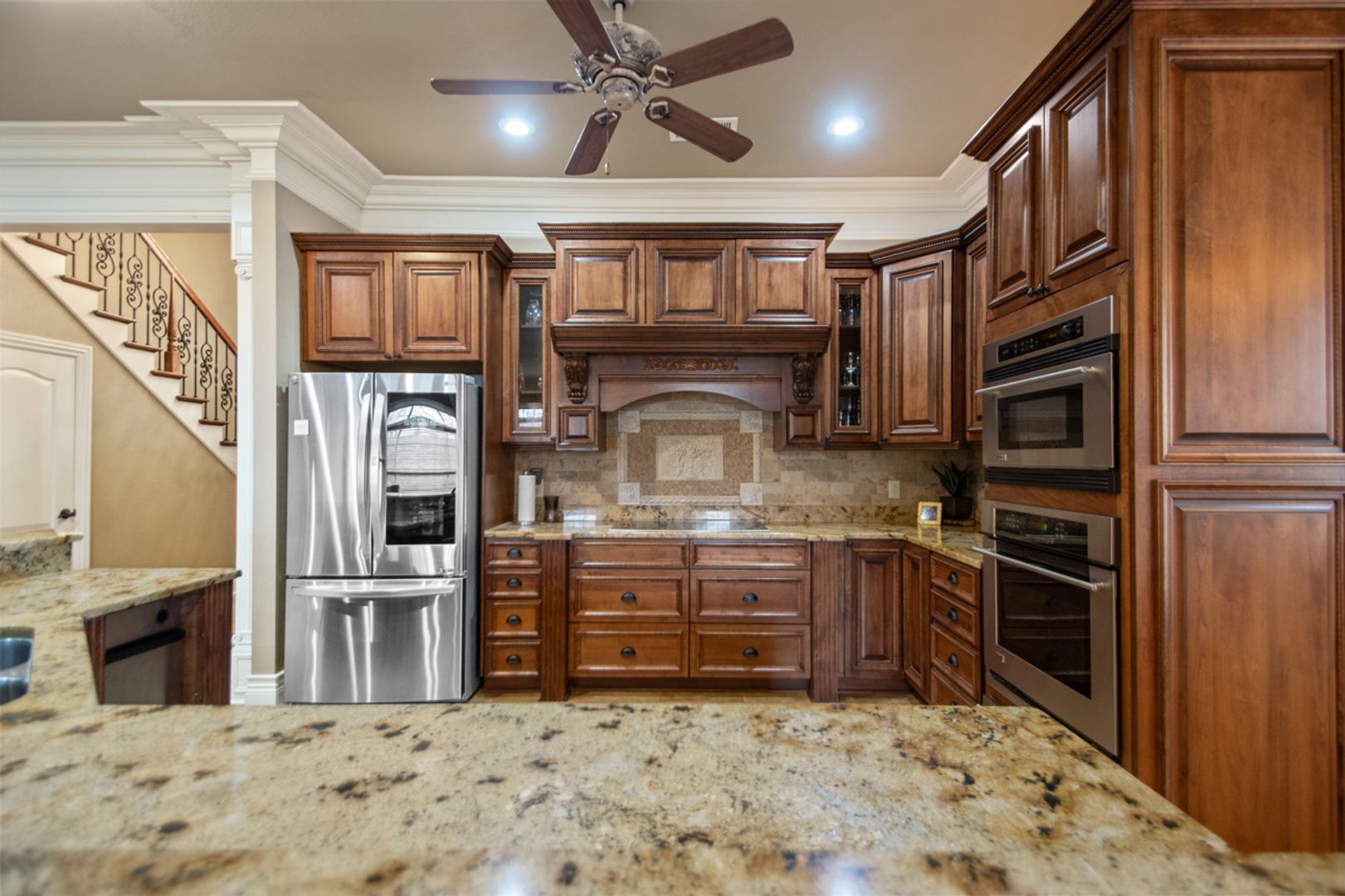 Large kitchen with roomy cabinet & counter space, featuring granite counters, and stainless steel appliances