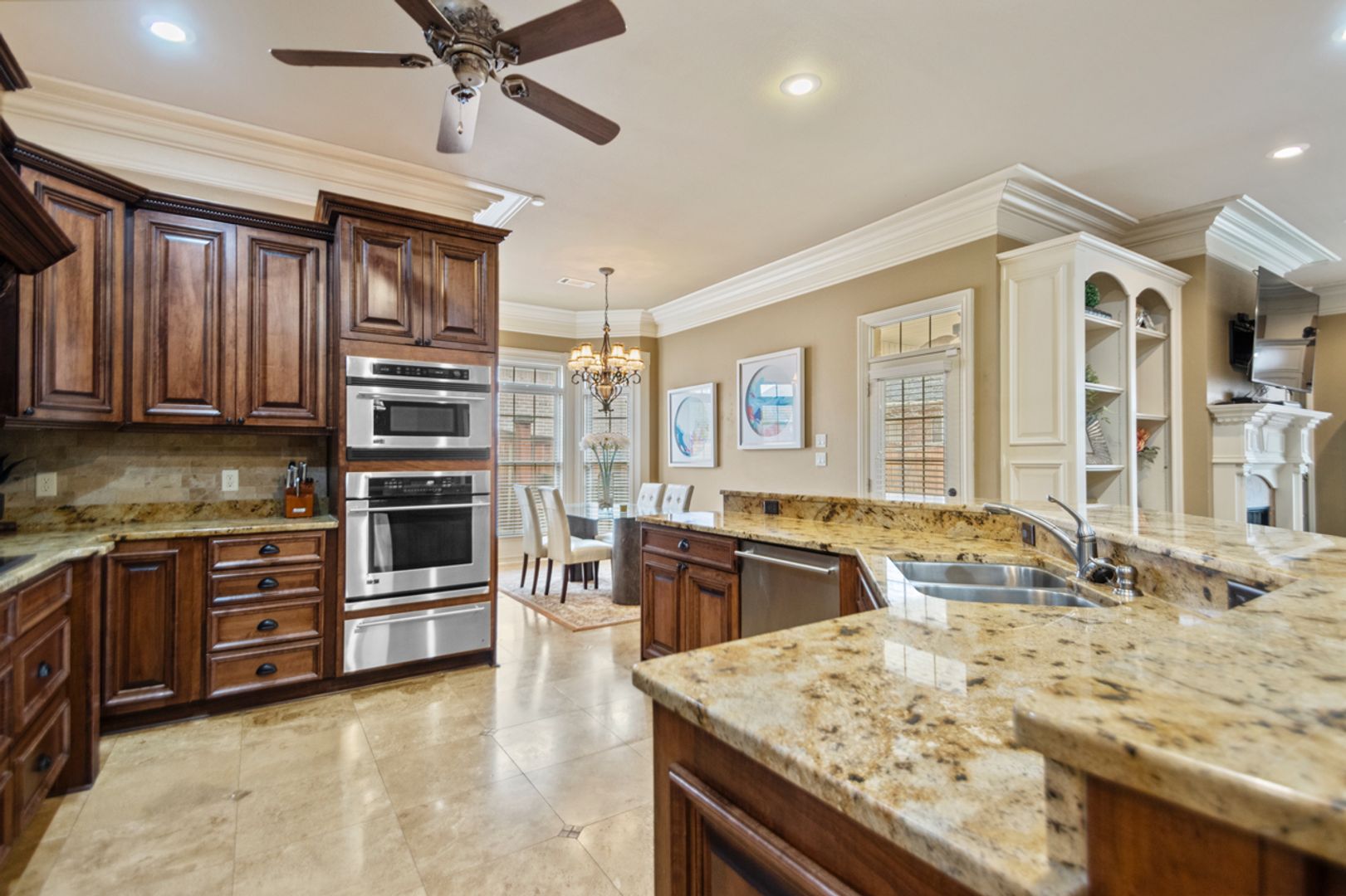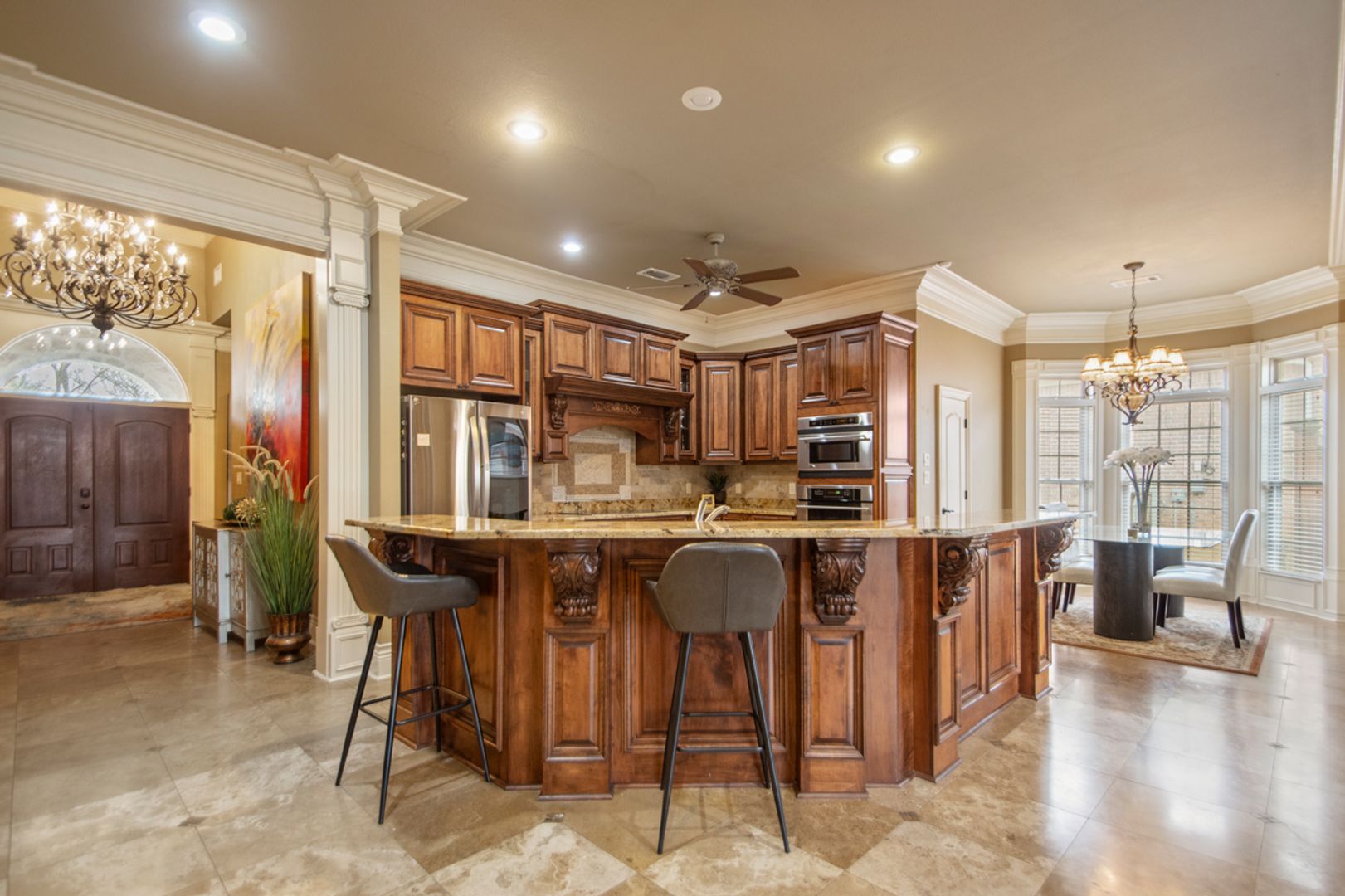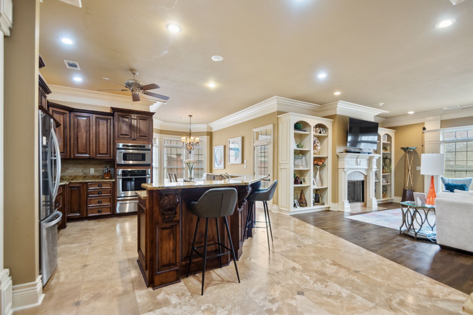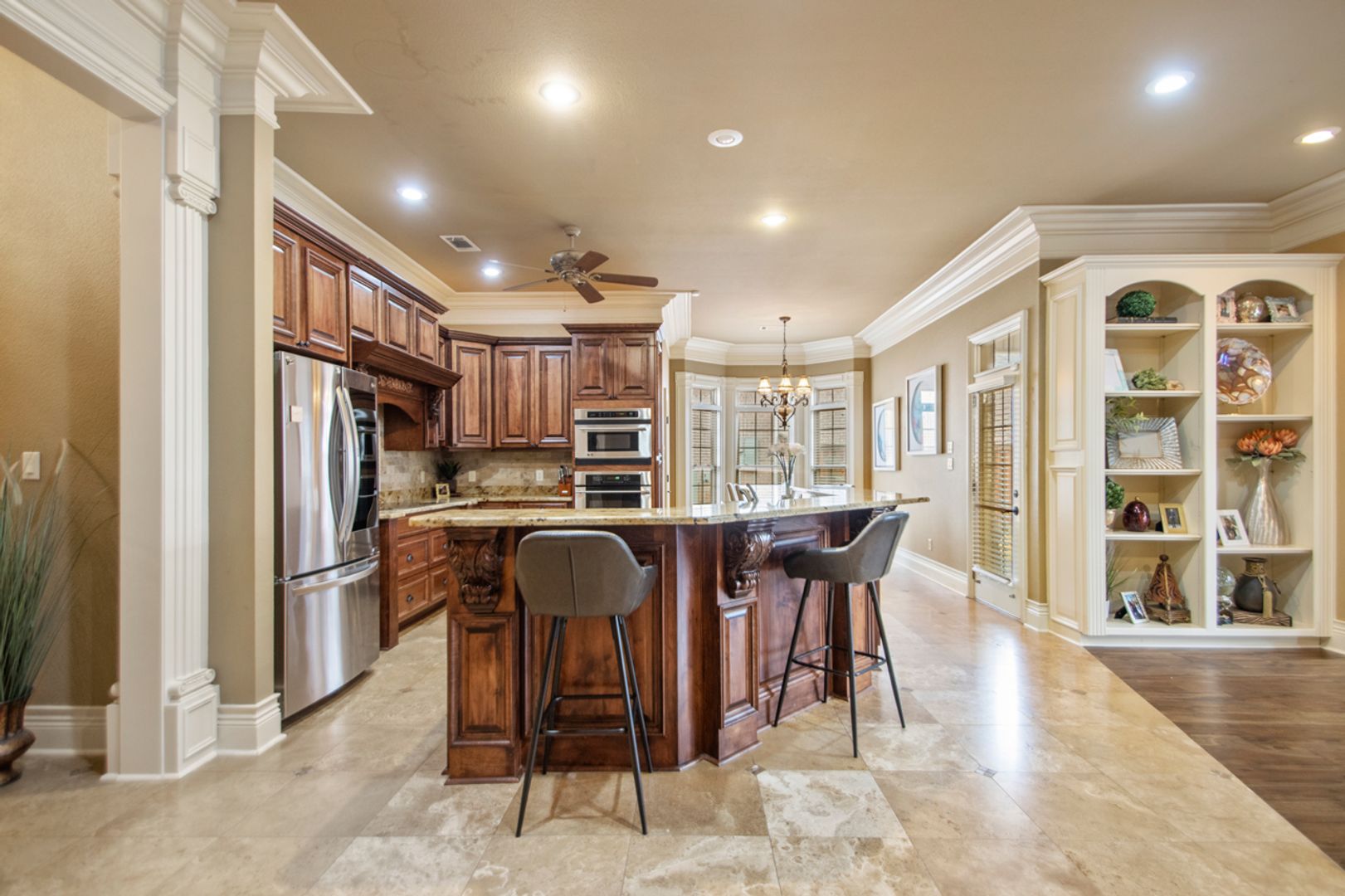 Elegant travertine & rich hardwood floors throughout