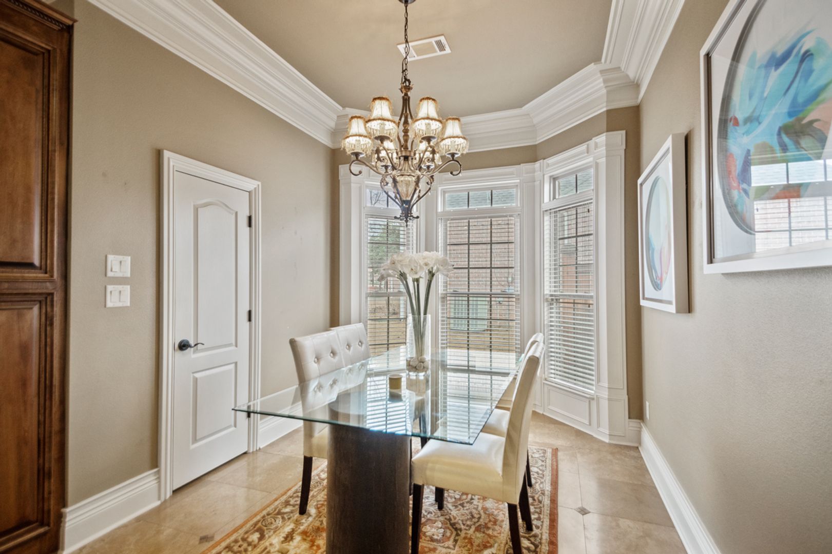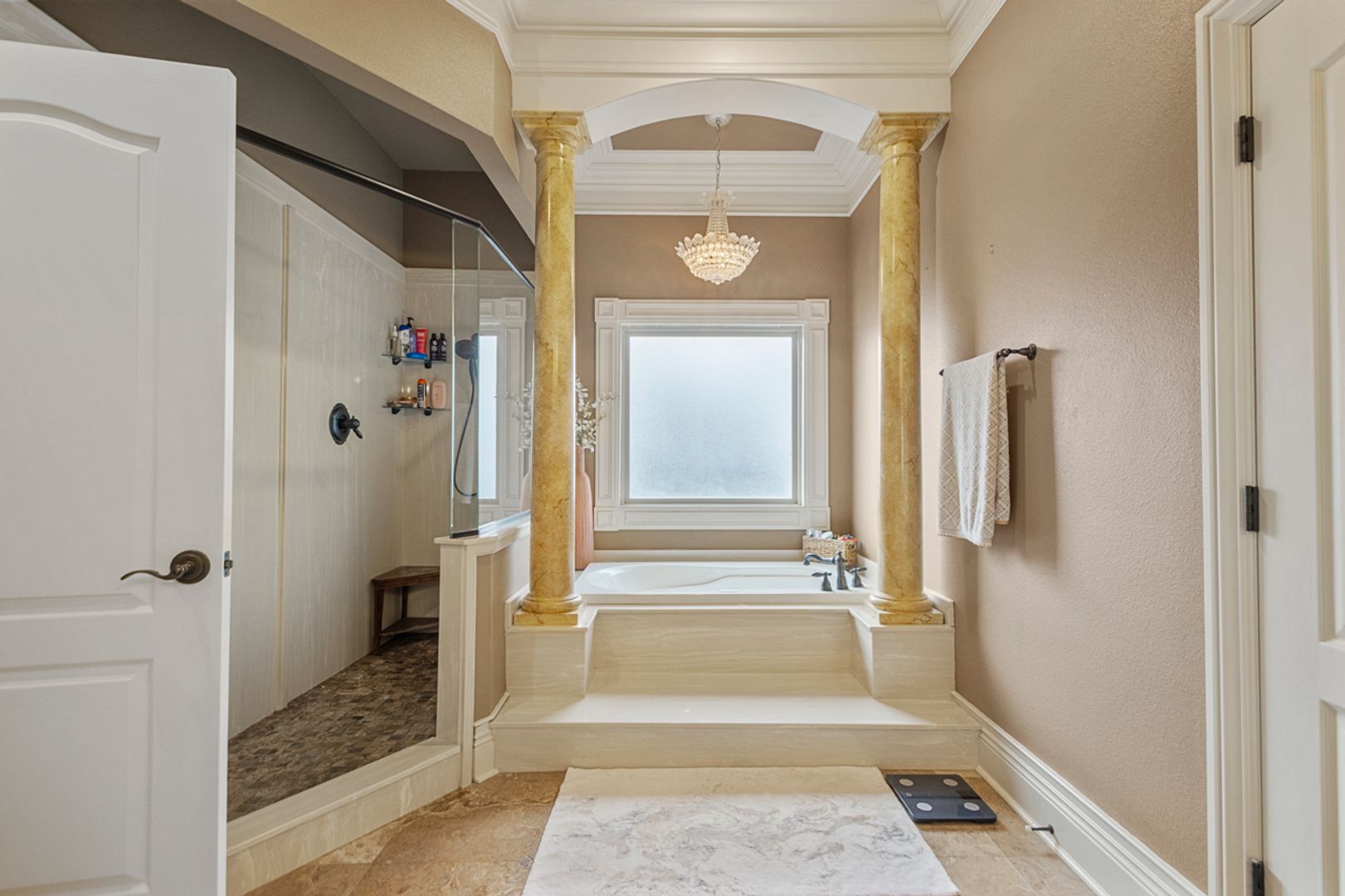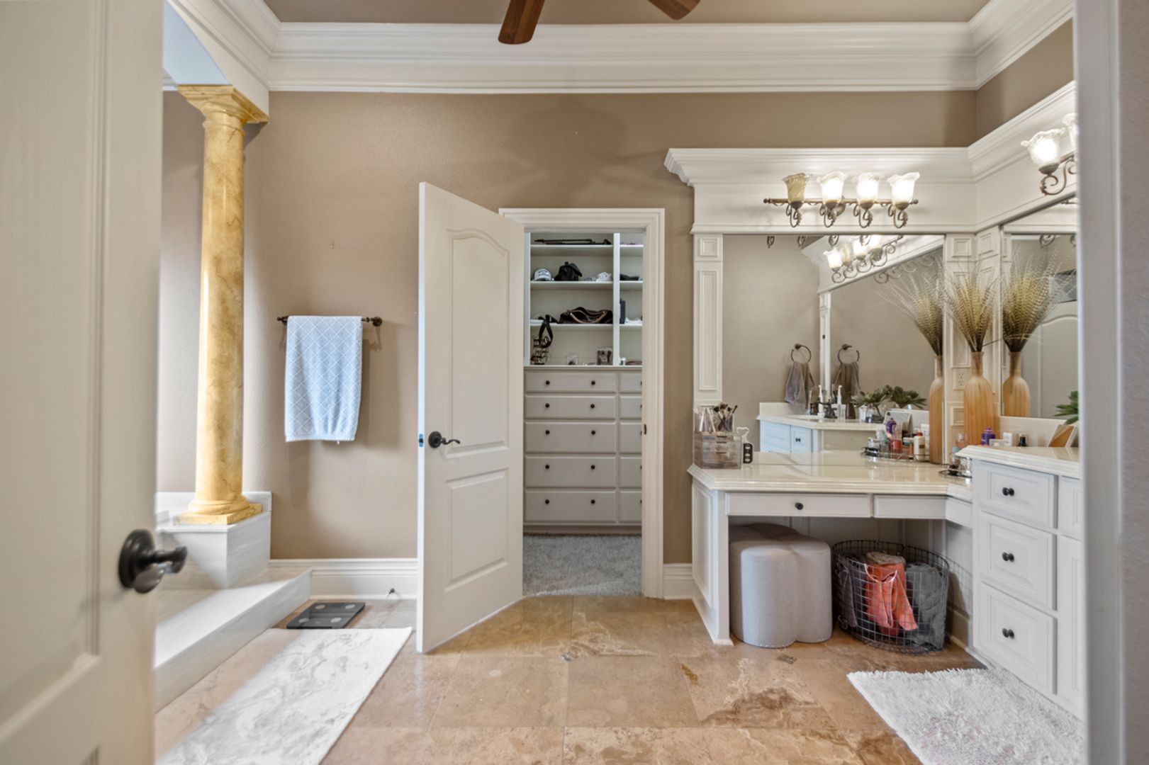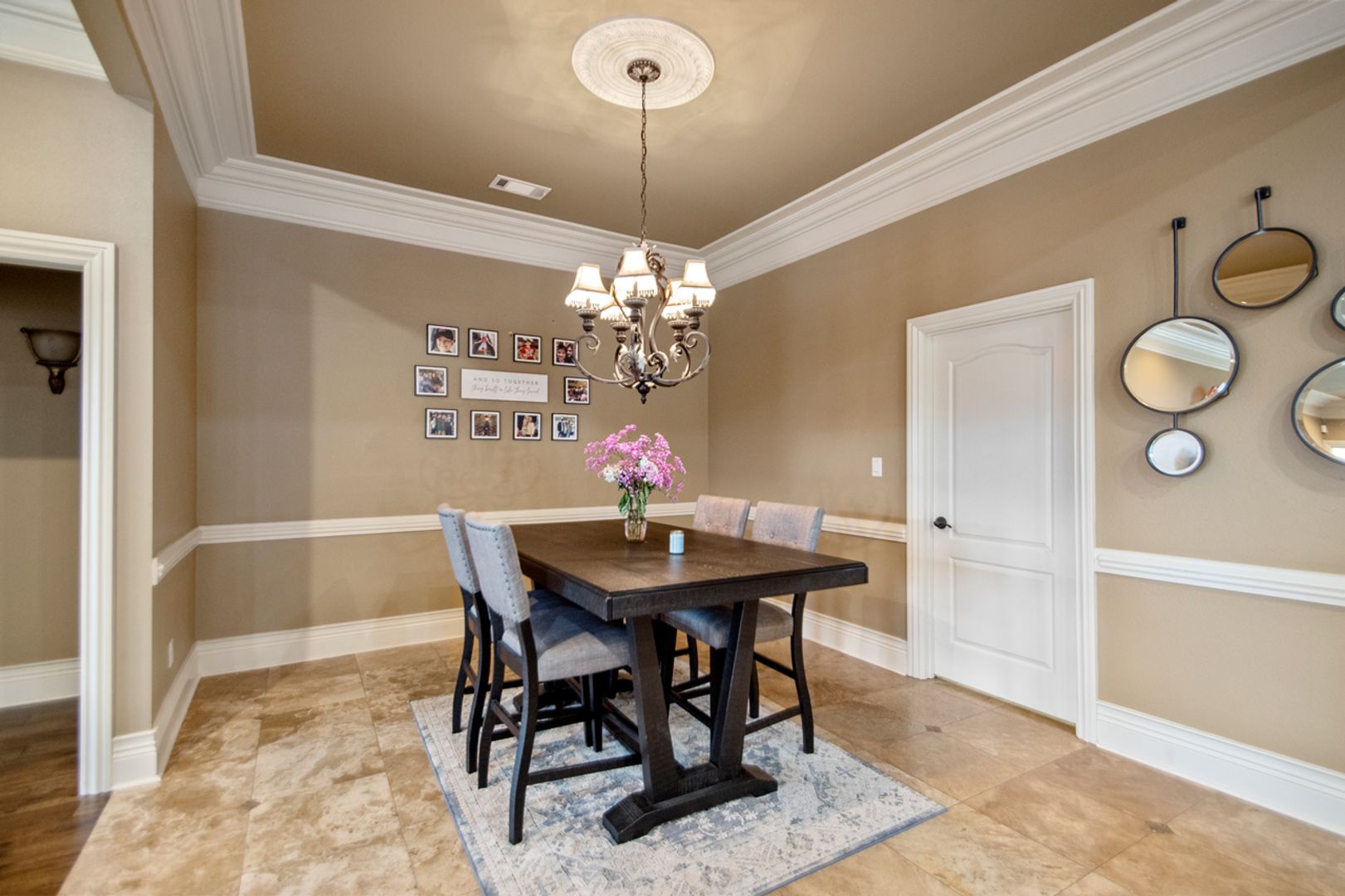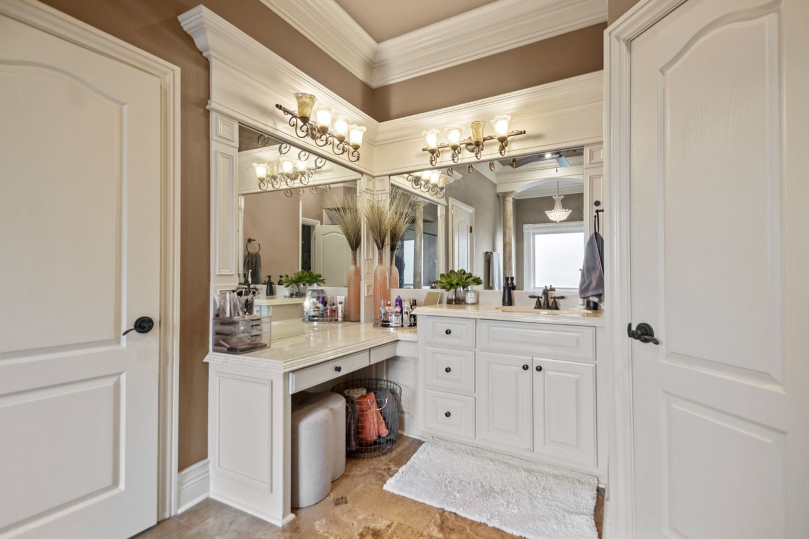 Elegant travertine & rich hardwood floors throughout