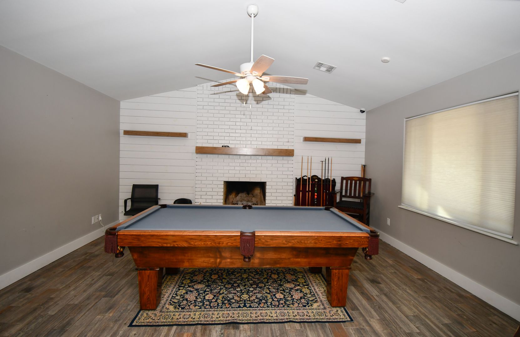 layout features both a den and a separate living room with a fireplace, offering plenty of space to